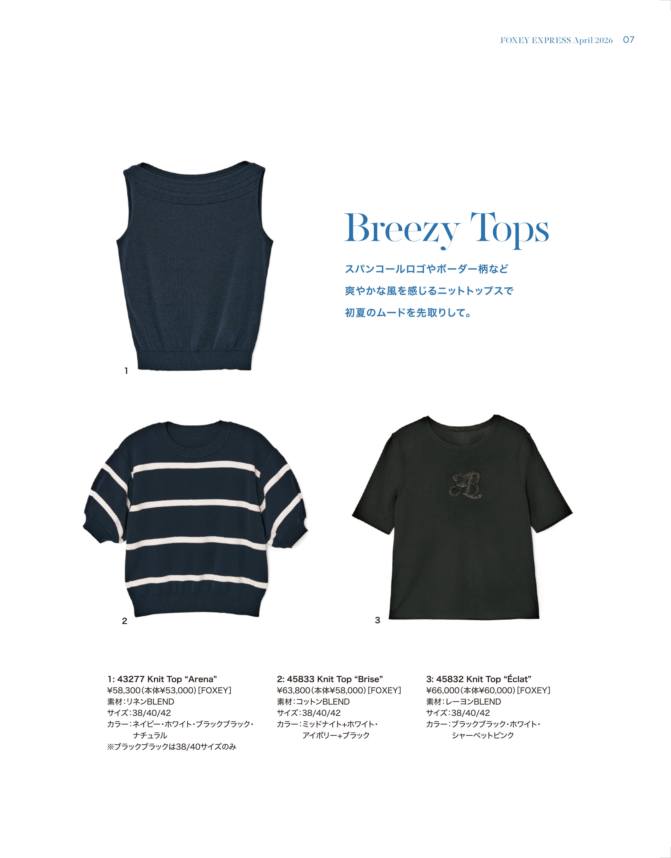 スパンコールロゴやボーダー柄など爽やかな風を感じるニットトップスで初夏のムードを先取りして。