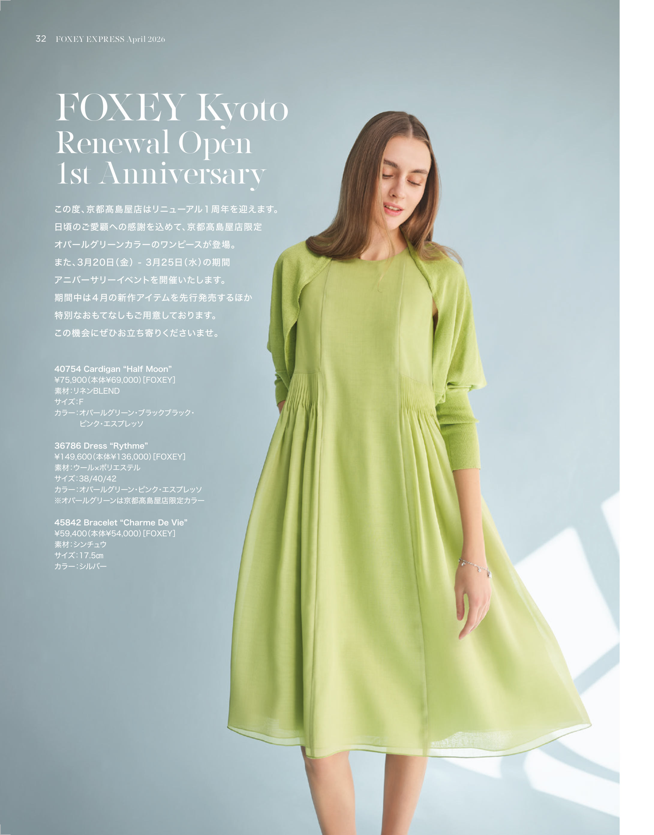 日頃のご愛顧への感謝を込めて、京都高島屋店限定オパールグリーンカラーのワンピースが登場。